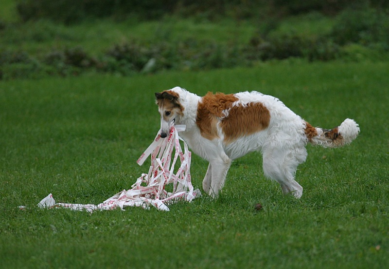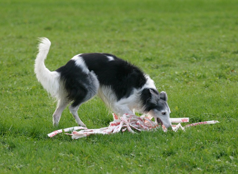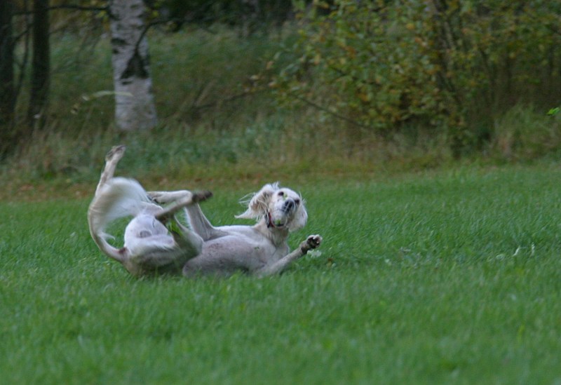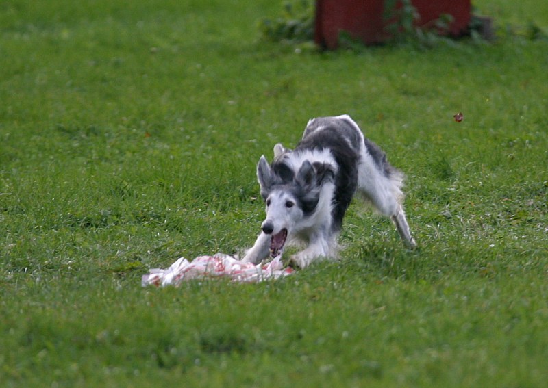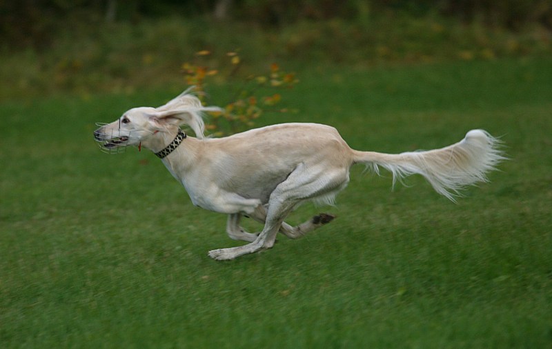 Kostea niitty oli vähän liukas, mutta vain pari koiraa kaatui. Tämä saluki esitti yhden harvoista lipoista.