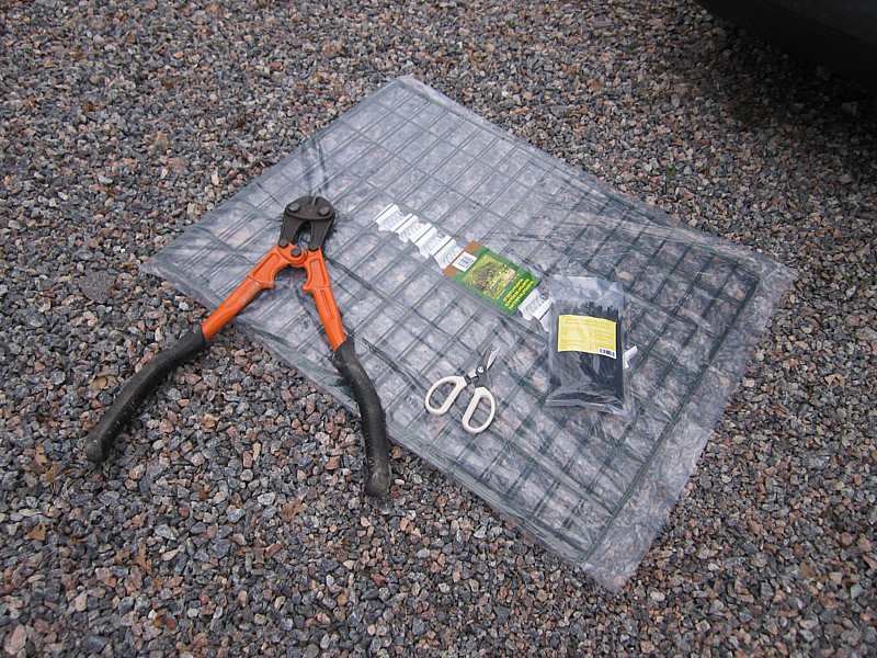 Työvälineet: Kaksi pakettia kompostikehikkoa Biltemasta a 9,9 euroa. Paketti mustia UV-suojattuja 19 cm pitkiä nippusiteitä 4 euroa Biltemasta. Pultti- eli voimapihdit koosta riippuen 10-75 euroa. Jos sinulla ei ole isoja pihtejä, voit käyttää rautasahaa mutta se on hidasta hommaa. Sakset tai sivuleikkurit tarvitaan nippusiteiden leikkaamiseen.