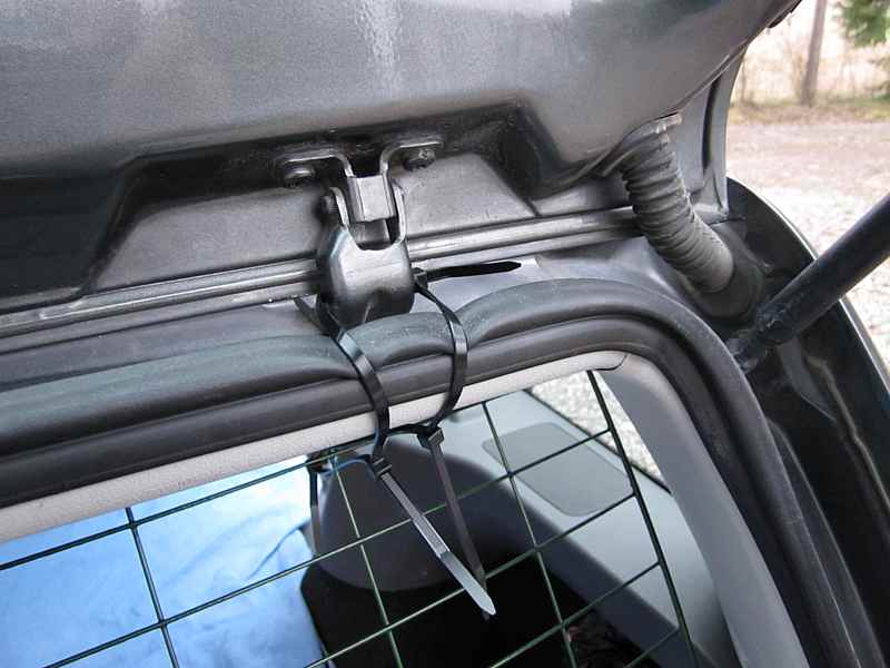Taivutetaan verkon yläpää siten, että se nojaa kattoon. Varmistu, ettei mitään teräviä kärkiä tms. ota kiinni kattoon tai muutoin sinulla on kohta reiällinen katto. Kiinitetään verkon yläpää takaluukun saranoihin näin. Koska nippusiteet ovat liian lyhyitä joudut ketjuttamaan niitä peräkkäin. Katso että nippusiteen neliskanttiset päät eivät ota kiinni tiivisteeseen, ettei tiiviste kärsi.