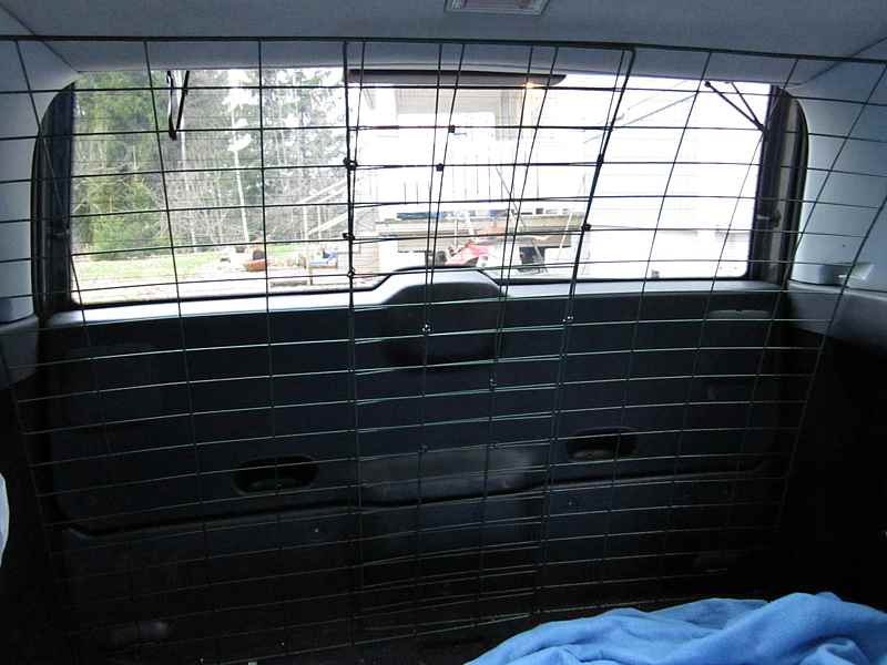 Jälleen huntun näkökulmaa. Huomaa taas, että kattoa vasten ei saa olla mitään teräviä kärkiä tms. Ja käännä katkaistujen nippusiteiden päiden terävät reunat pois päin koirista, etteivät saa pään tynkää silmäänsä jossain äkkijarrutuksessa.