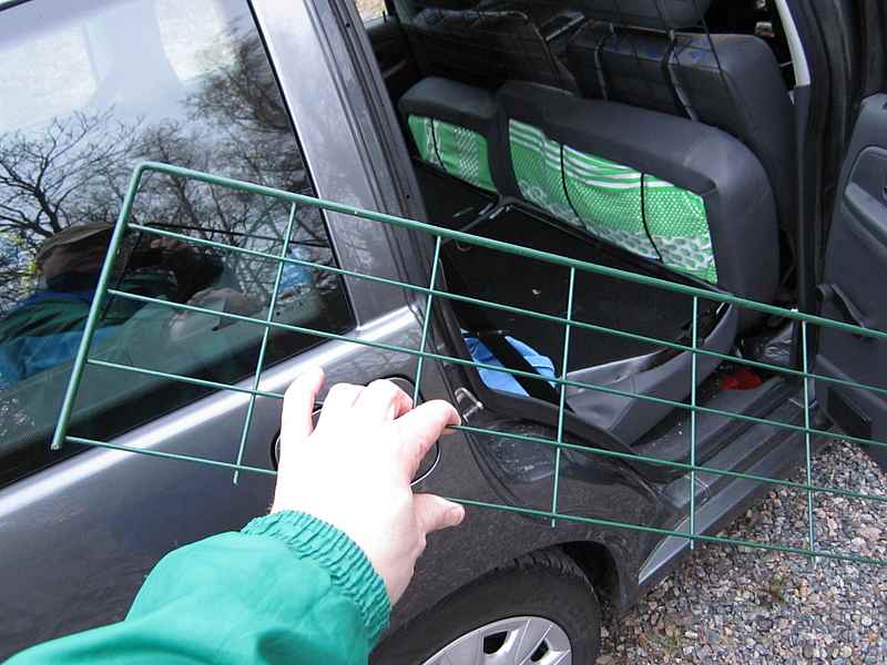 Tämä auto on niin pieni, että verkko pysyy paikallaan penkkien puristuksessa tosi hyvin ilman kiinnitystäkin. Verkkoa voisi kyllä kiinnittää turvavöiden pidikkeisiin ylhäällä ja alhaalla ja päänojien jalkoihin, jos olisi tarvetta. Ovien pitää mennä kiinni mutta samalla verkkoa ei saa voida kiertää sivusta. Varmistu, ettei verkko ota kiinni lasiin.