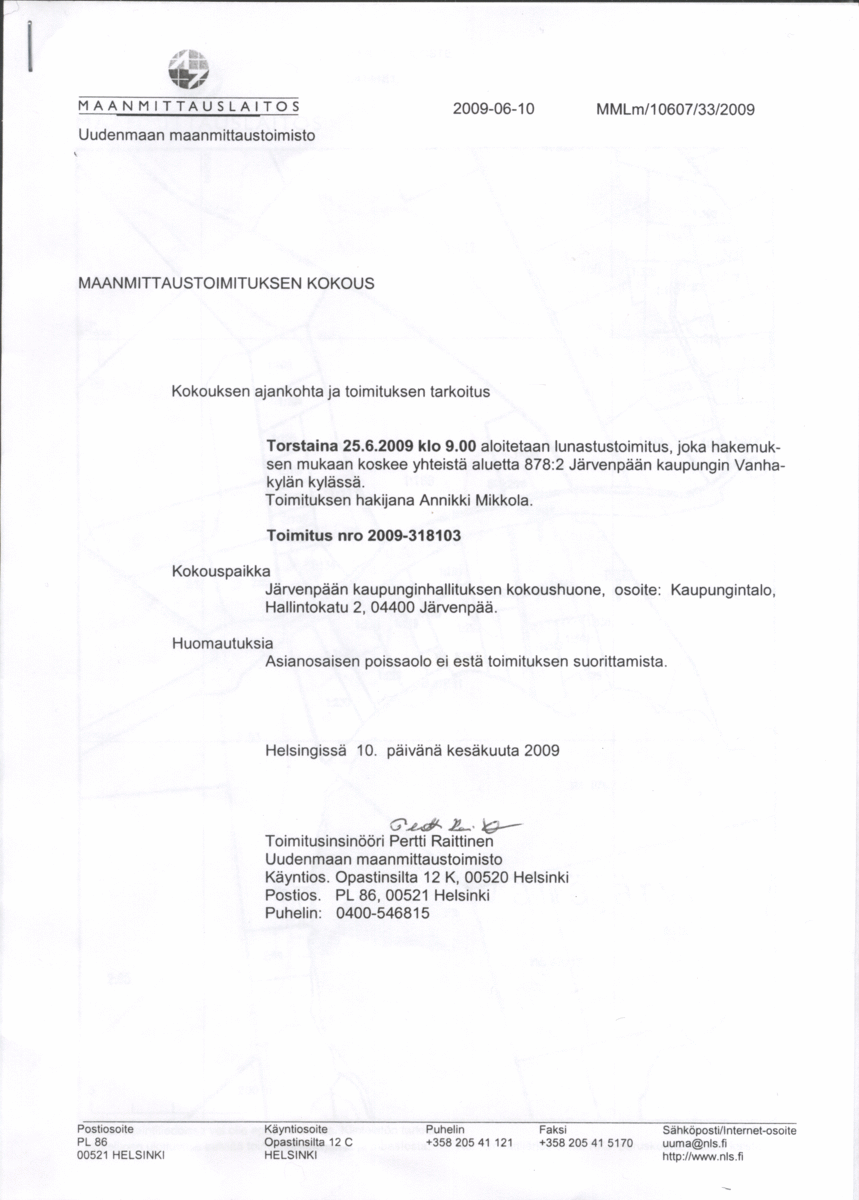 Maanantaina 15.06.2009 löytyi postilaatikostani kirje Maanmittaustoimistolta (Kirje näyttää tältä: Kirjeen sivu yksi, Kirjeen sivu kaksi) jonka on lähettänyt toimitusinsinööri Pertti Raittinen ja jossa sanotaan että Annikki Mikkola on hakenut lunastustoimitusta, ja että se on ensi viikon torstaina 25.6.2009 klo 9 Järvenpään kaupunginhallituksen kokoushuoneessa kaupungintalolla Hallintokatu 2, 04400 Järvenpää. Ja että "asianosaisen poissaolo ei estä toimituksen suorittamista".